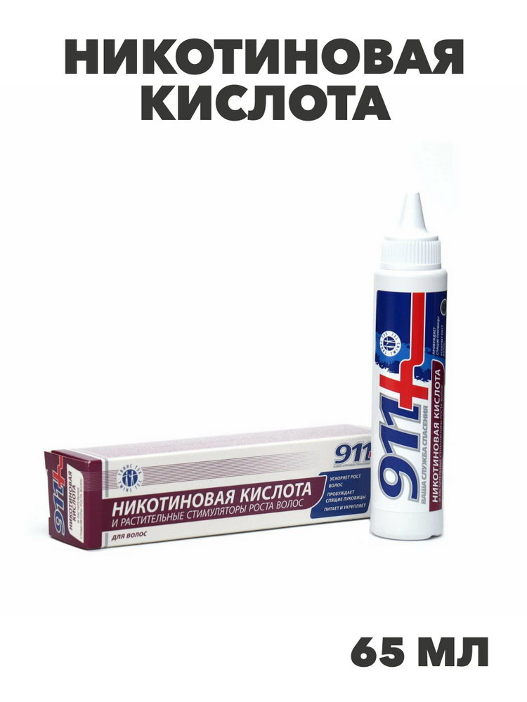 911 НИКОТИНОВАЯ КИСЛОТА И РАСТИТЕЛЬНЫЕ СТИМУЛЯТОРЫ РОСТА ДЛЯ ВОЛОС косметическое средство для укрепления и стимуляции роста волос. При нанесении на кожу головы никотиновая кислота (витамин В3) усиливает кровообращение, улучшает транспортировку кислорода и полезных микроэлементов, ускоряет в тканях процессы обмена веществ, что препятствует выпадению волос и стимулирует их ускоренный рост. Никотиновая кислота в сочетании с активным растительным комплексом (экстракты листа березы, листа крапивы, ромашки, золотого проса, хны, хвоща, хмеля, лопуха, шалфея, зеленого чая, гель алоэ вера) защищает кожу и волосы от вредного воздействия внешних факторов, борется с облысением, волосы становятся гуще, приобретают блеск и шелковистость