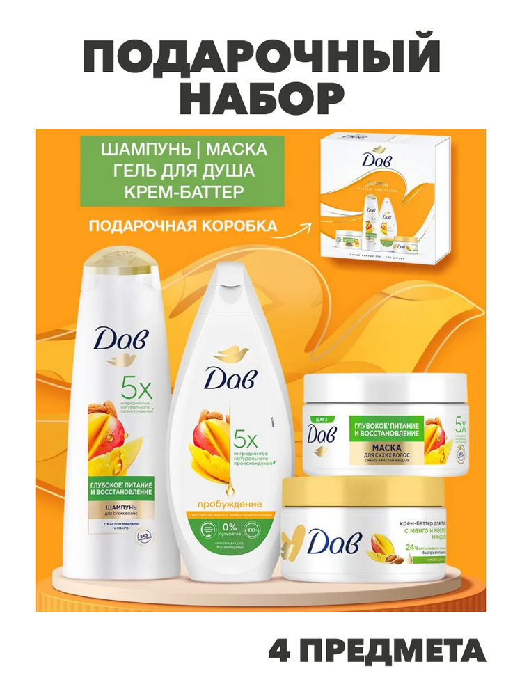 Дав Подарочный набор для женщин косметический MANGO SPA, шампунь и маска для волос, гель для душа и крем баттер для тела, бьюти-бокс, 4 предмета, n4377-289985
