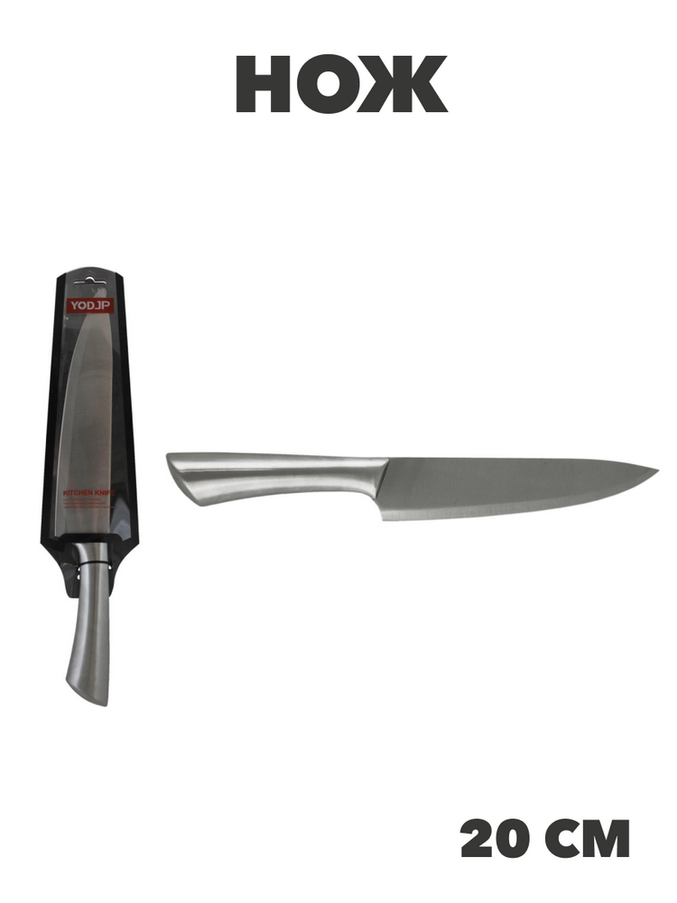 Рукоятка ножа выполнена из пищевого пластика. Длина лезвия 20 см, длина ручки 13 см. Кухонный нож рекомендован к использованию в бытовых условиях. Не рекомендуется использовать в посудомоечной машине.