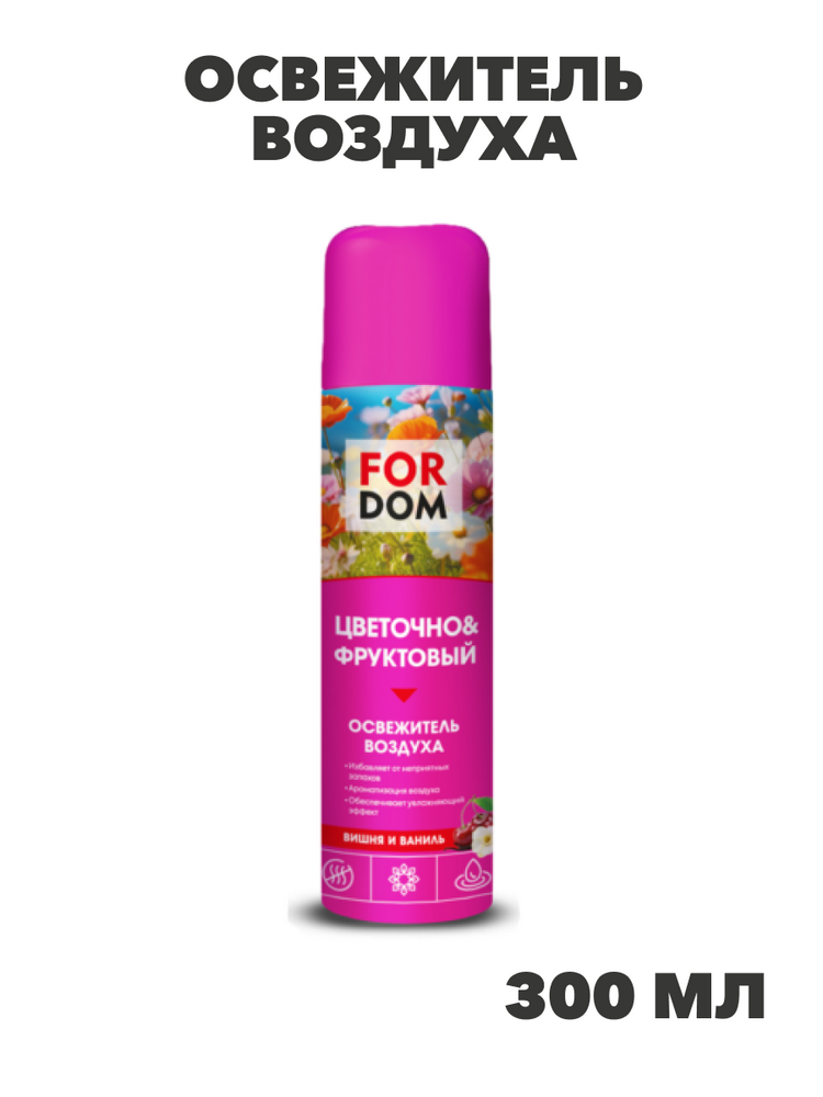 Откройте для себя мир свежести и гармонии вместе с освежителем воздуха ForDom! Уникальная композиция цветочно-фруктового аромата мгновенно преобразит любое помещение, наполнив его нежностью цветов и сочностью фруктов. Этот освежитель станет Вашим верным помощником в борьбе с неприятными запахами, будь то табачный дым, кухонные ароматы или влажные помещения. Подходит для использования в жилых домах, офисах, гостиницах, а также ванных и туалетных комнатах. Освежитель не оставляет пятен и следов на поверхностях, поддерживает приятный микроклимат помещения длительное время. Создавайте уют и комфорт вокруг себя с каждым нажатием! Объем: 300 мл.