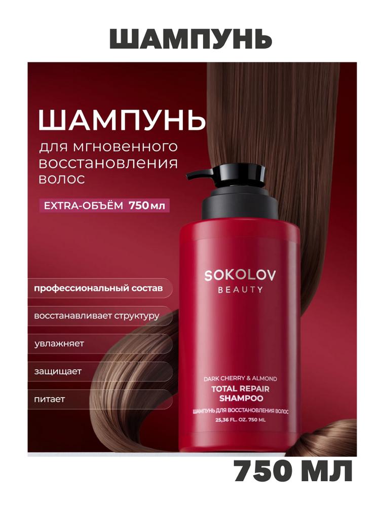 Шампунь для волос SOS‐восстановление Dark Cherry & Almond от SOKOLOV в формате 750 мл для ежедневного ухода, когда важны сила, гладкость и блеск без утяжеления, для семьи и салонного использования. Сок вишни в уходовой косметике насыщает волосы антиоксидантами, укрепляет и поддерживает влагу, помогая уменьшить ломкость и шероховатость волос при регулярном мытье головы. Масло миндаля глубоко проникает в структуру и формирует защитный барьер на поверхности, смягчая кутикулу и снижая повреждения от укладок и термовоздействия. Коллоидное серебро обладает противовоспалительными свойствами: формула способствует чистоте кожи головы и комфортному ощущению после мытья. Пантенол интенсивно увлажняет и питает, поддерживая эластичность и визуальную плотность, помогая волосам выглядеть более ухоженными уже после первого применения шампунь. Комплекс белков: шёлк, эластин, кератин, коллаген — работает с повреждениями.