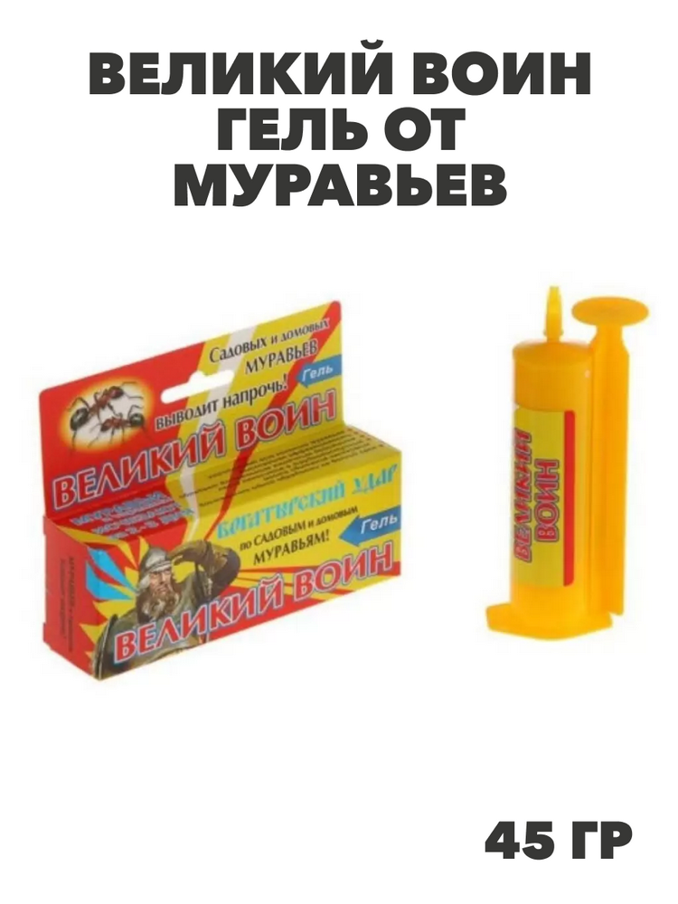 Гель от муравьев «Великий воин» — средство-приманка для борьбы с домовыми и садовыми муравьями, а также тараканами. В составе — вещества, направленные на уничтожение муравьиных колоний. Великий Воин эффективный гель от садовых и домовых муравьев. Яд начинает действовать не сразу, а спустя некоторый период. За это время рабочие муравьи успевают вернутся в муравейник и распространить яд на других особей, что в свою очередь приводит к гибели всей колонии домашних вредителей. Гель «Великий воин» выпускается в специальном шприце-дозаторе, ёмкостью в 45мл. Для борьбы с уличными муравьями препарат наносят на подложки и расставляют вокруг муравейников и на тропах. Также гель стоит нанести пунктиром (2см геля – 6 см интервал) по периметру дома снаружи и внутри. Желательно, чтобы на средство не попадали пыль и влага.Особенности: -Легко наносится в труднодоступные места в помещении и на улице благодаря удобному формату шприца.