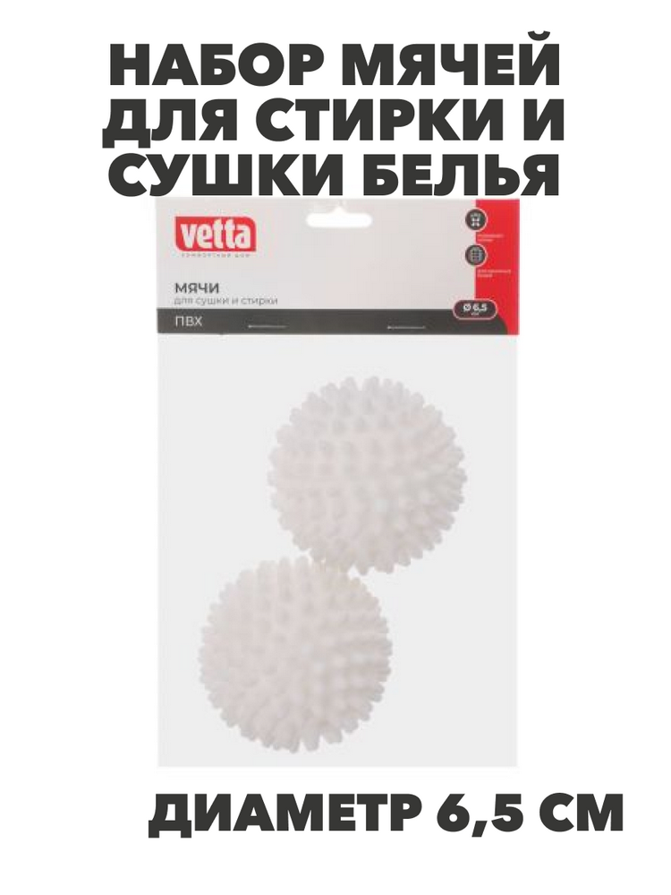 VETTA Набор мячей для стирки и сушки белья состоит из двух шариков диаметром 6,5 см, выполненных из прочного ПВХ (поливинилхлорида). Благодаря своей текстурированной поверхности с мягкими шипами без острых краев, эти мячи оказывают механическое воздействие на белье в барабане. Они эффективно разбивают комки, не дают вещам сбиваться в плотную массу, что особенно полезно при стирке пуховых изделий, одеял и подушек.